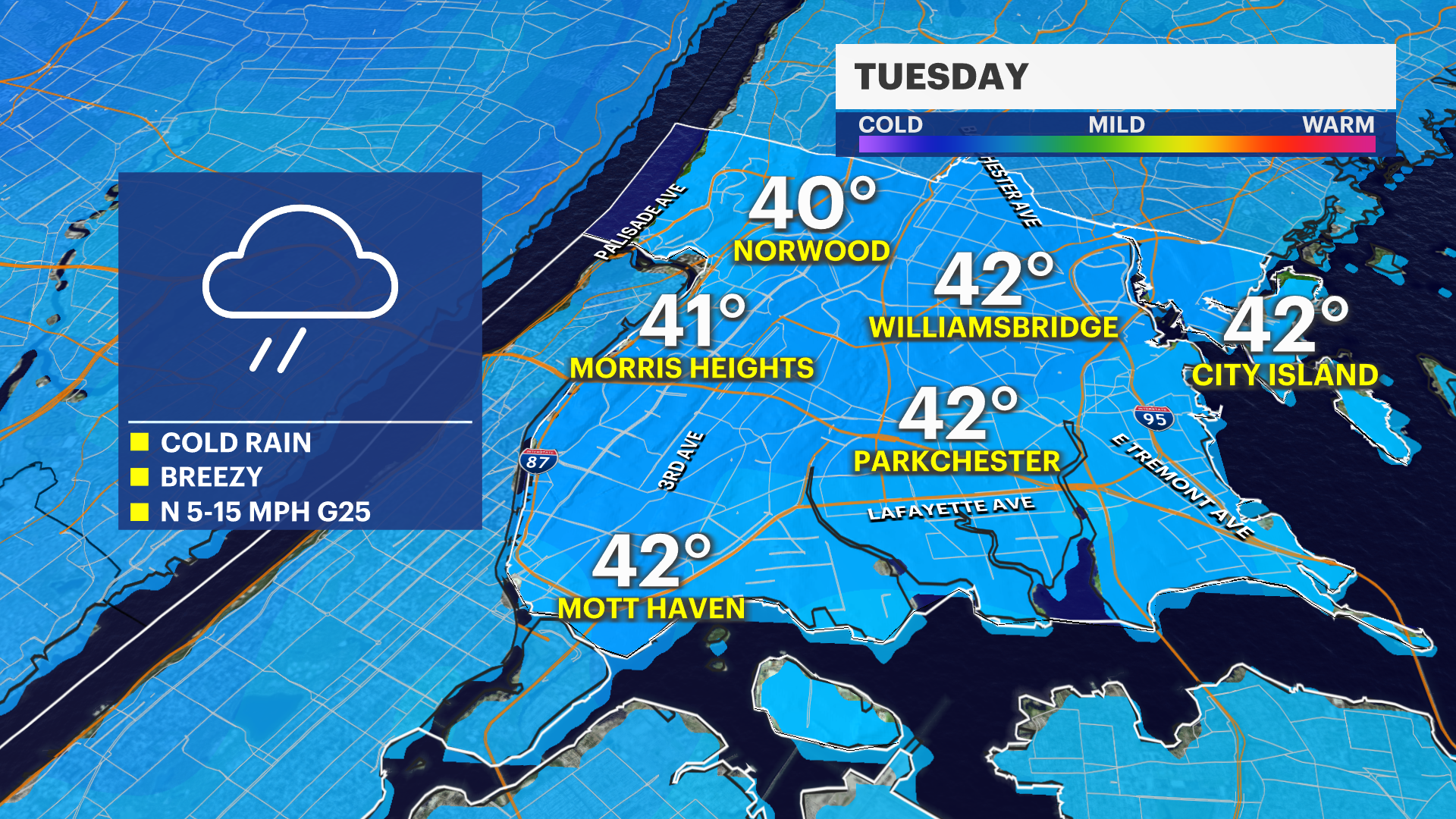• After yesterday's storm, an arctic front sweeps in late this week with the coldest air of the season so far. Tomorrow will be another cold day but with a wintry wind. Snow showers will stay north and west of the city, but temperatures will start to rapidly fall throughout the day with gusty winds. During the evening commute, wind chills will be in the 20s.