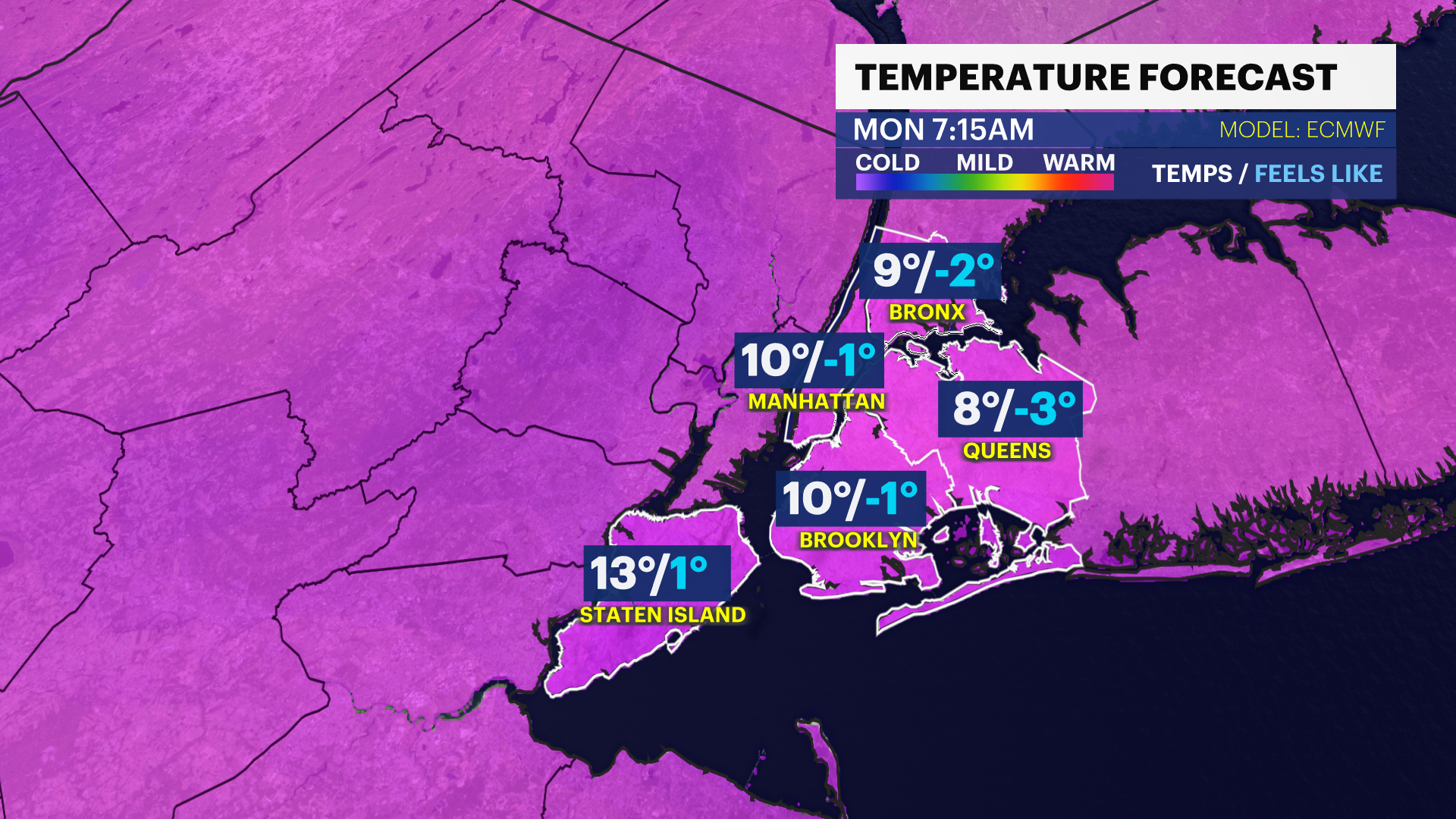 Monday: Sunny but cold, with highs in the upper 20s to near 30. Brisk northwest winds keep it feeling colder.