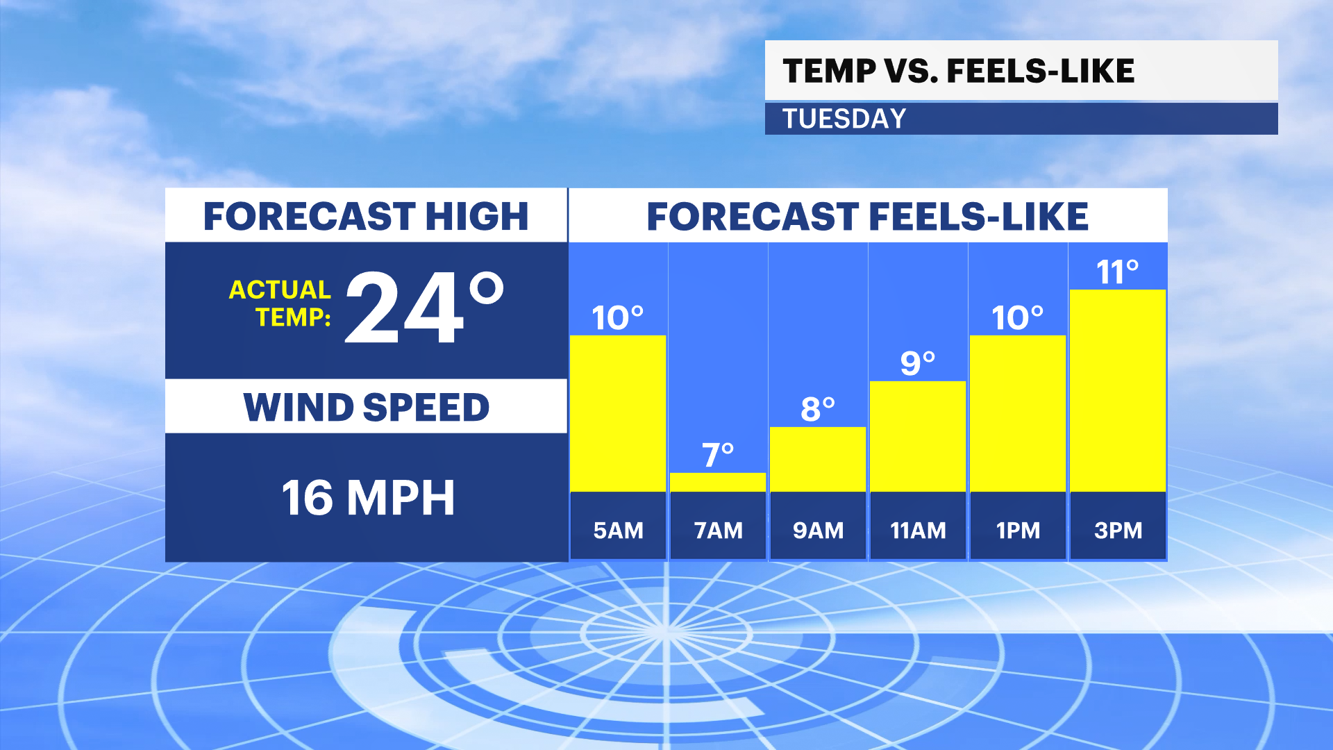 Dangerously cold wind chills are expected on Tuesday. The worst will be in the morning and then again at night.