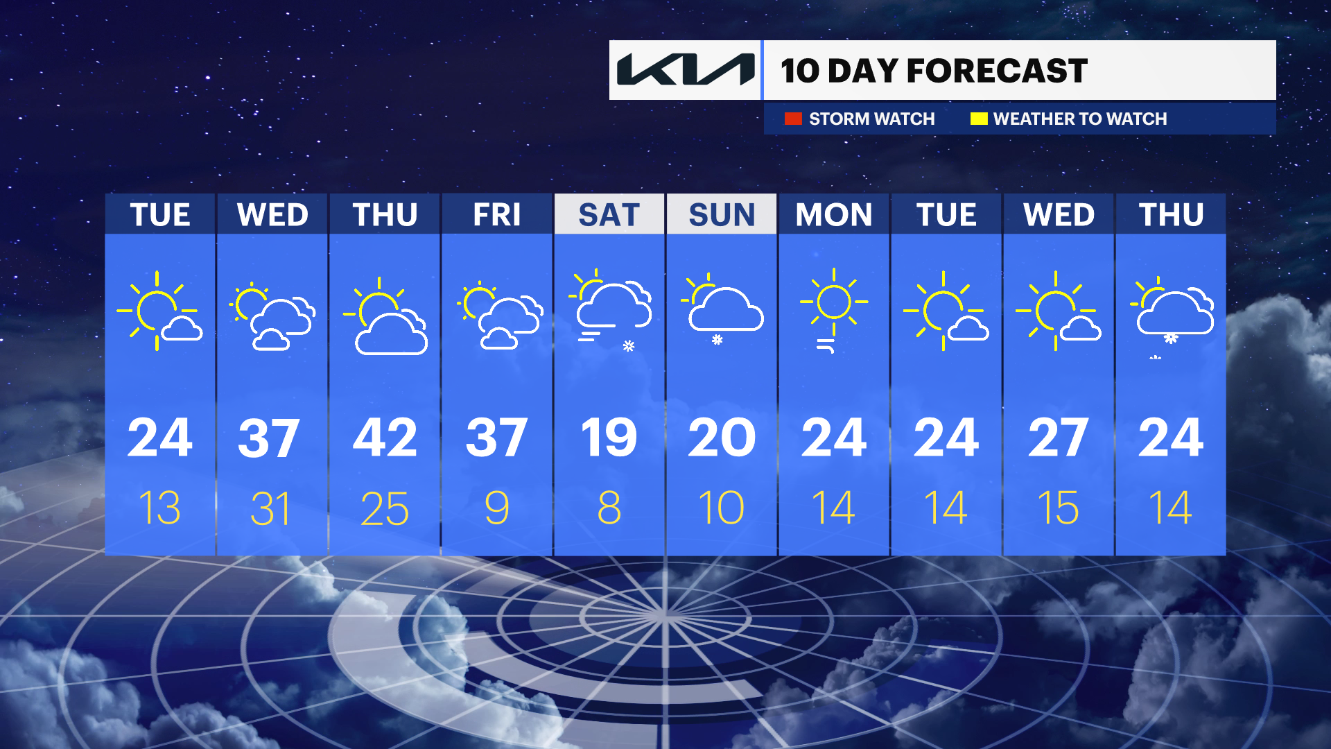 Temperatures this week will stay below normal, rebounding only on Thursday, before the cold returns quickly into the weekend. Thursday's high will be in the low to mid-40s.
