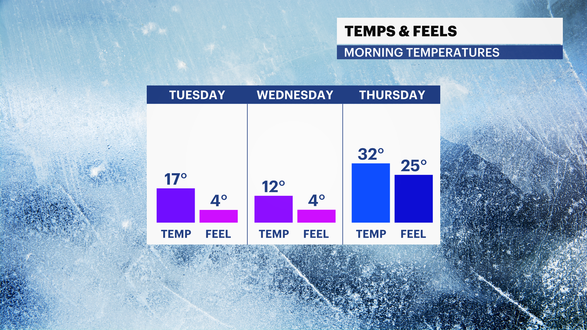 Wind chills will remain cold throughout the day, feeling more like the single digits and teens. Temperatures will not rise above freezing until Wednesday, so watch for patchy ice. Anything that looks wet will really be icy.