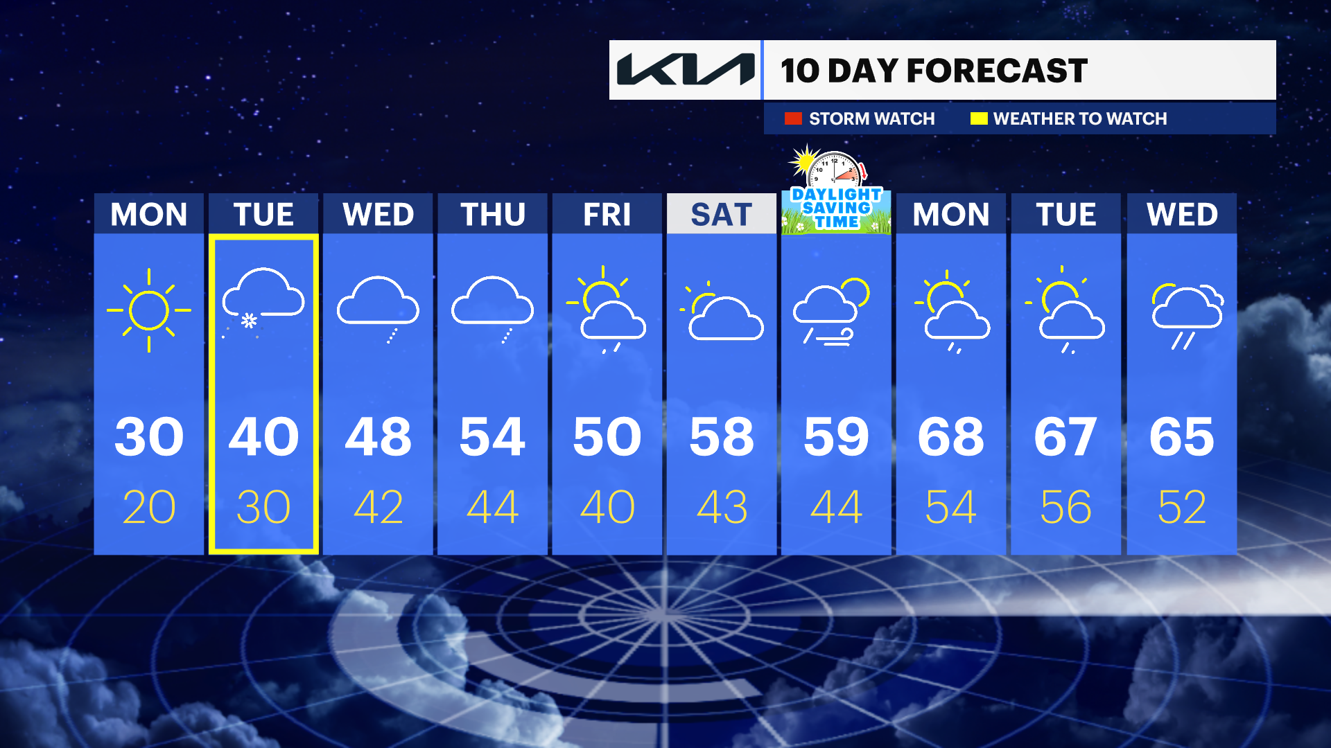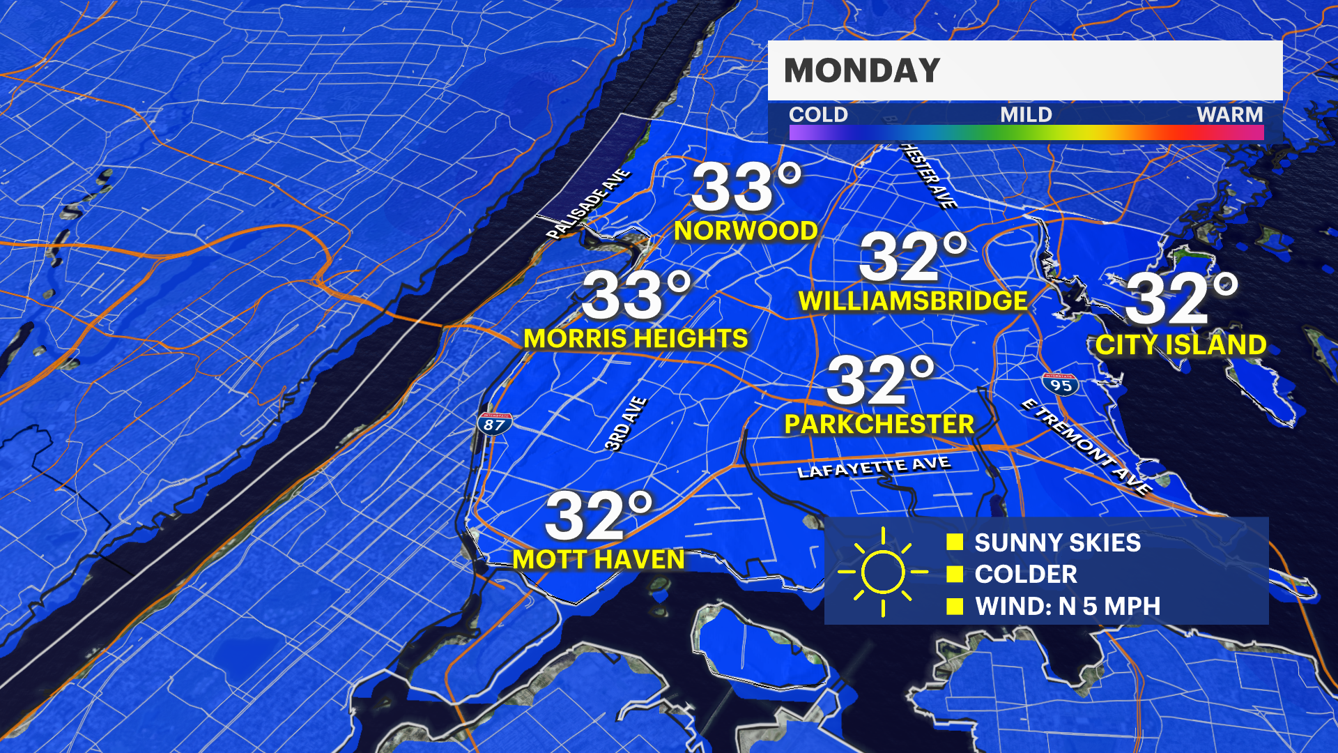 MONDAY: Mostly sunny and colder. Highs range from the upper teens in the morning to around 30 in the afternoon.