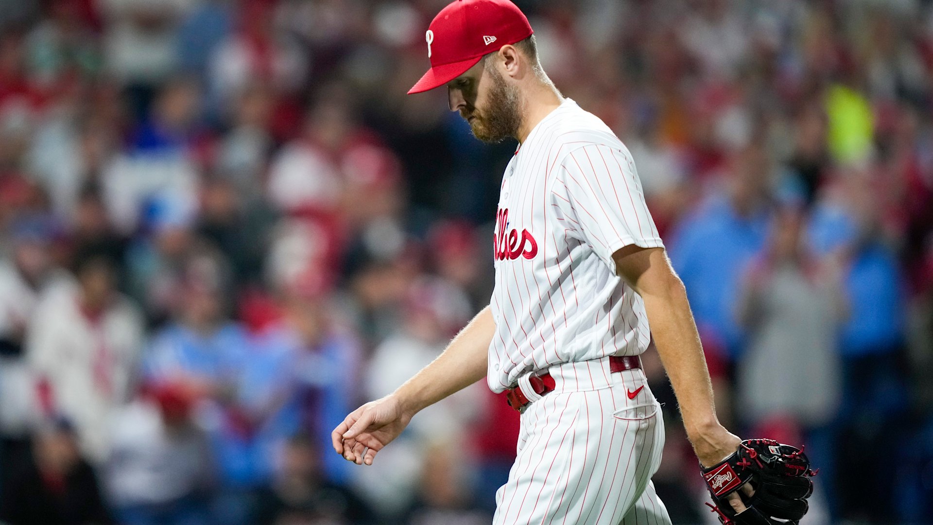 Philadelphia Phillies starting pitcher Zack Wheeler leaves the game during the ninth inning in Game 7 of the baseball NL Championship Series Arizona Diamondbacks in Philadelphia Tuesday, Oct. 24, 2023. (AP Photo/Matt Slocum)