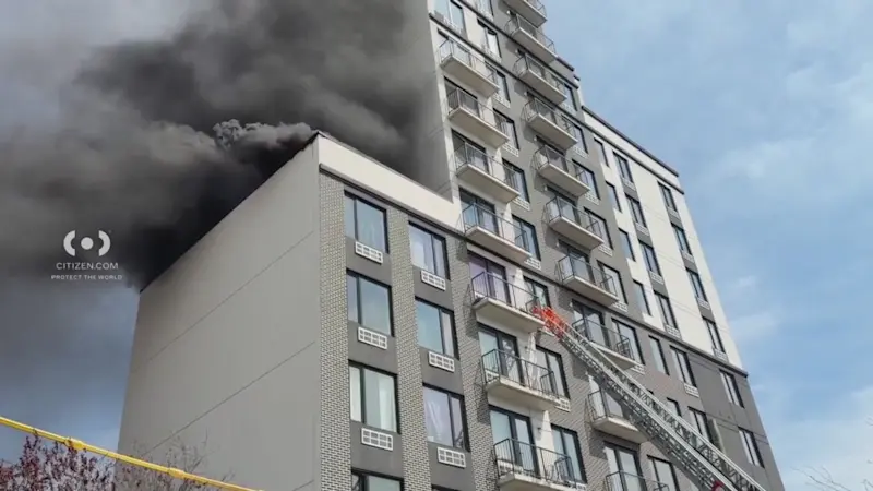 Citizen app footage taken around 2:30 p.m. Wednesday on Atlantic Avenue shows thick black smoke billowing from the building as firefighters climb to reach the blaze.