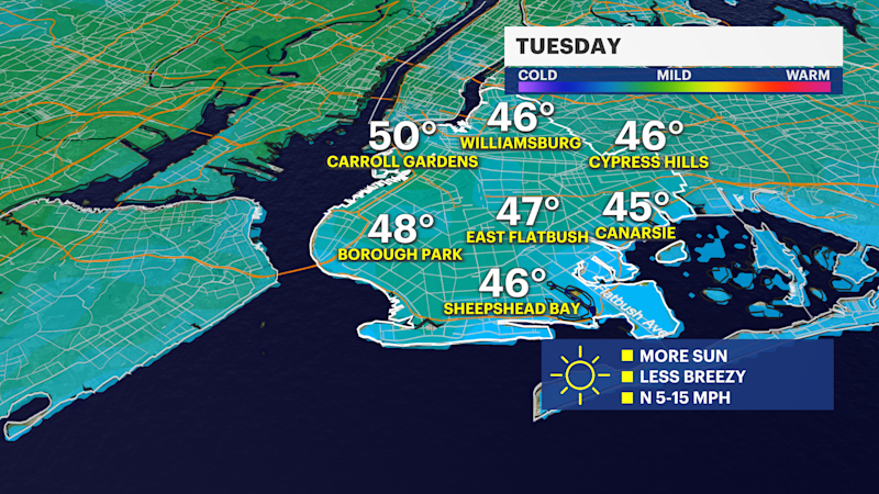 Drier conditions, with sunshine for Tuesday in Brooklyn