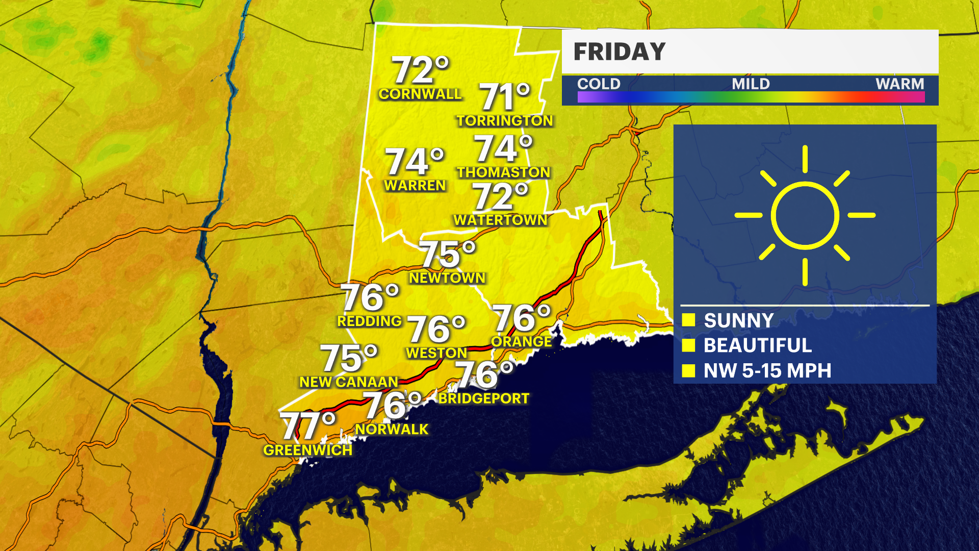NEXT: Saturday will be gorgeous with lots of sun and highs in the 70s. Sunday will be partly sunny and warmer and more humid. Monday and Tuesday will see more clouds and the chance of some scattered showers.