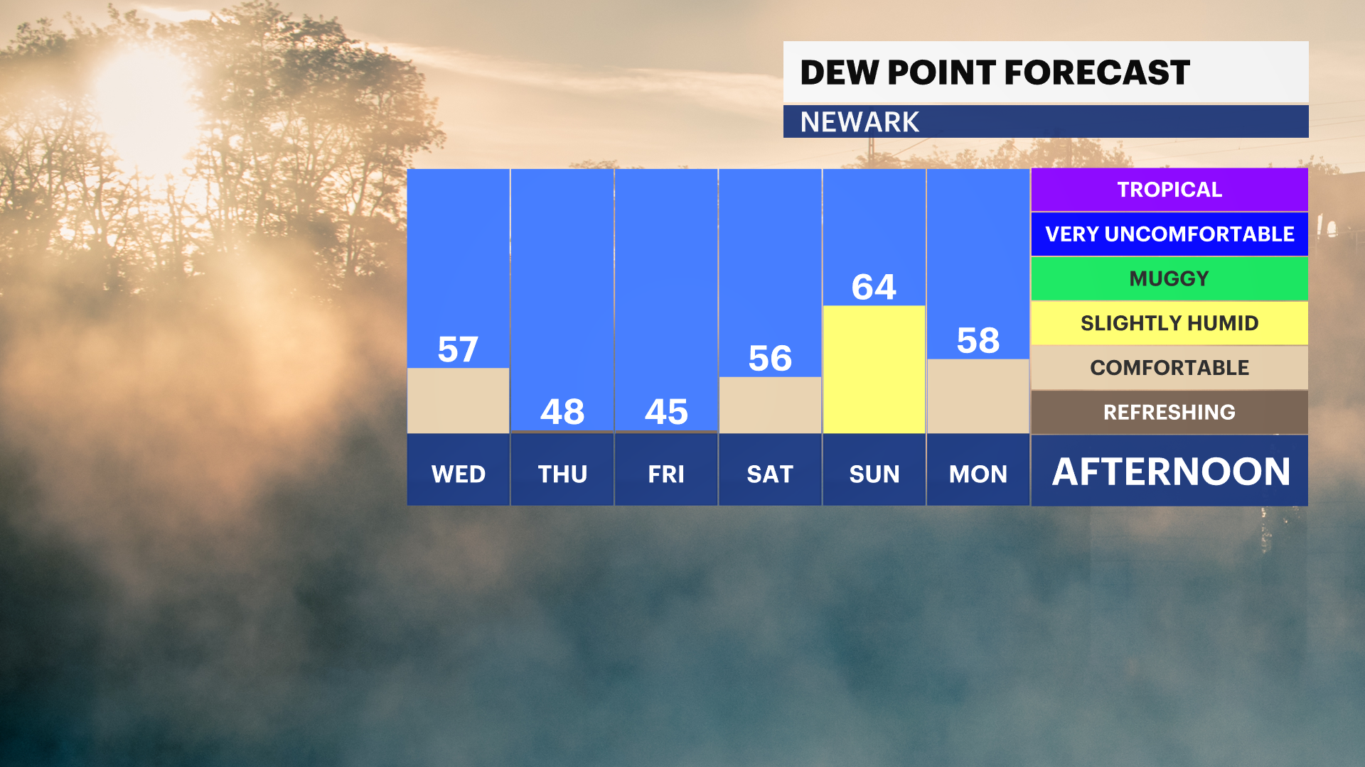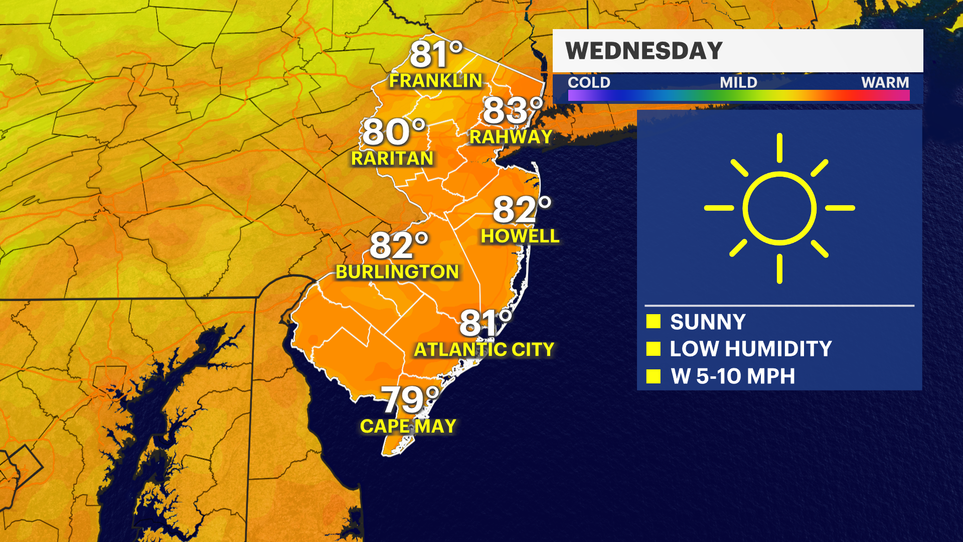 WEDNESDAY: Grab a jacket to start the day, with morning temps in the 50s. Temps rise to the 80s by the afternoon. Mostly sunny skies with low humidity. Overnight lows around 62.