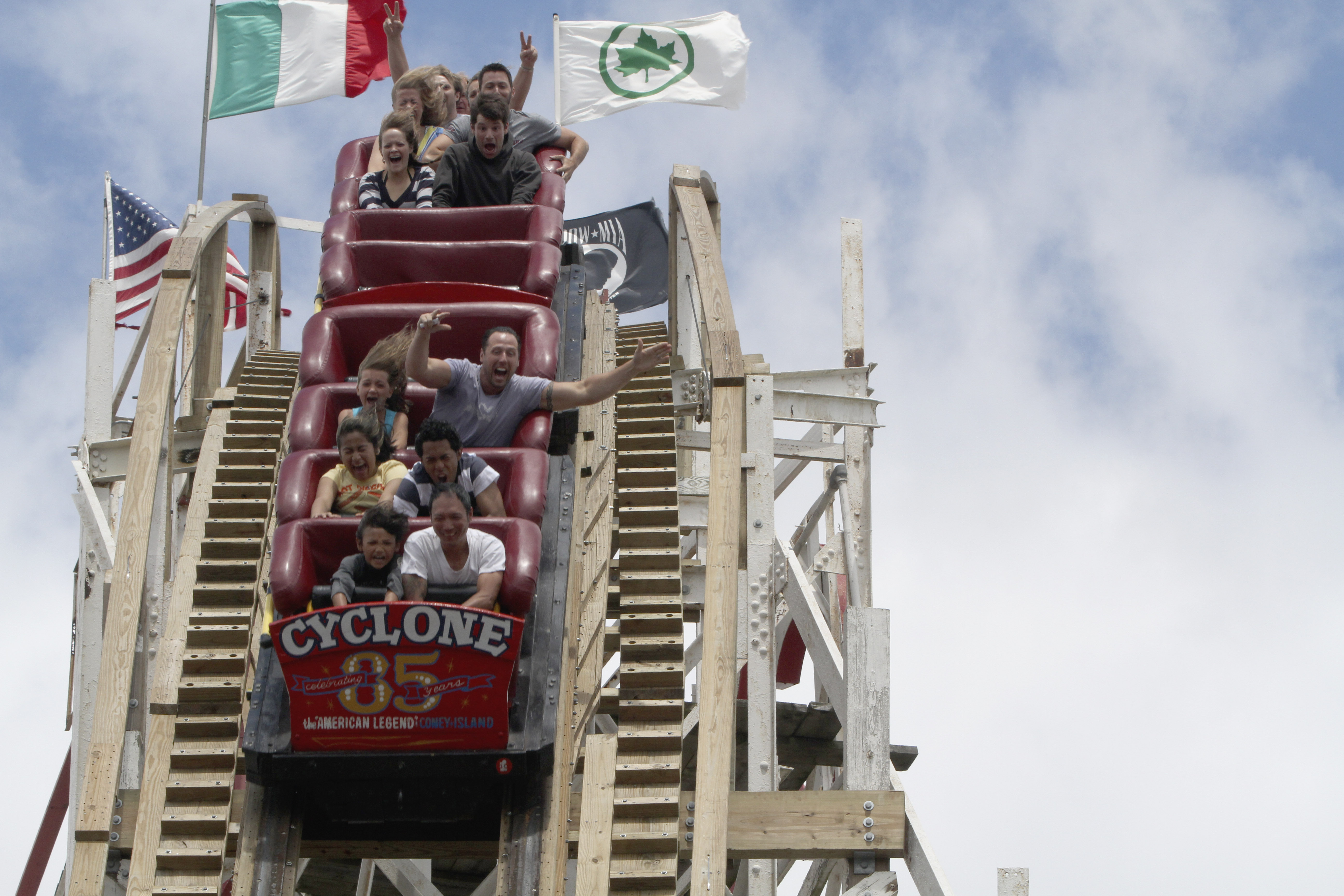 Visitors to Coney Island ride the Cyclone at Luna Park in Brooklyn on Sunday, April 13, 2014. The rides of Coney Island opened for another season with the 1920s wooden roller-coaster being christened with a dousing of a traditional egg cream drink. It marked the opening of the 40 rides of Luna Park. (AP Photo/Julie Walker)