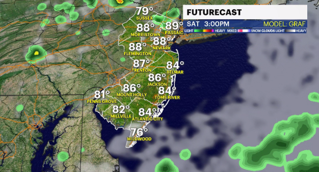 SATURDAY: Partly sunny, slight chance for p.m. showers. Highs in the mid- and upper-80s.