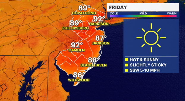 FRIDAY: Mostly sunny and hot. Highs around 90, feels like 90-95.