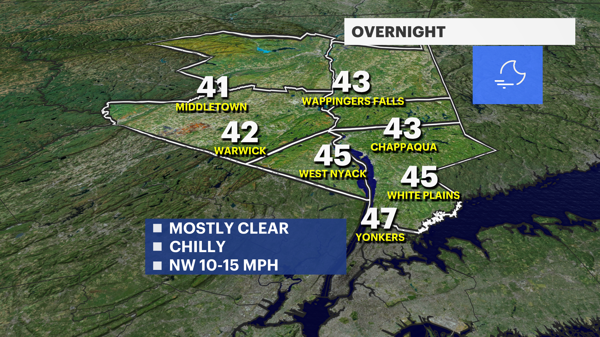 OVERNIGHT: Mostly clear skies. Cool. Lows again in the 40s with some higher elevations in the upper-30s. Still breezy.