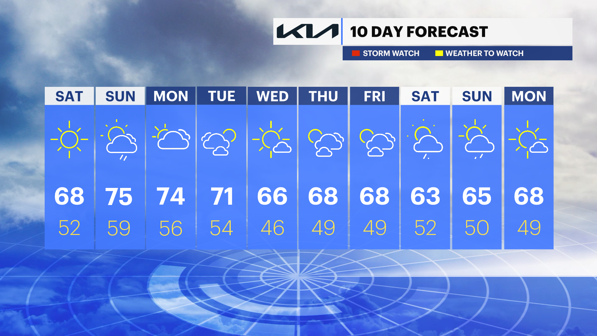 SUNDAY: Some sun to start, then becoming cloudy. Showers/storms are possible in the afternoon. Warmer with highs in the mid-70s, but morning clouds could keep some spots cooler.