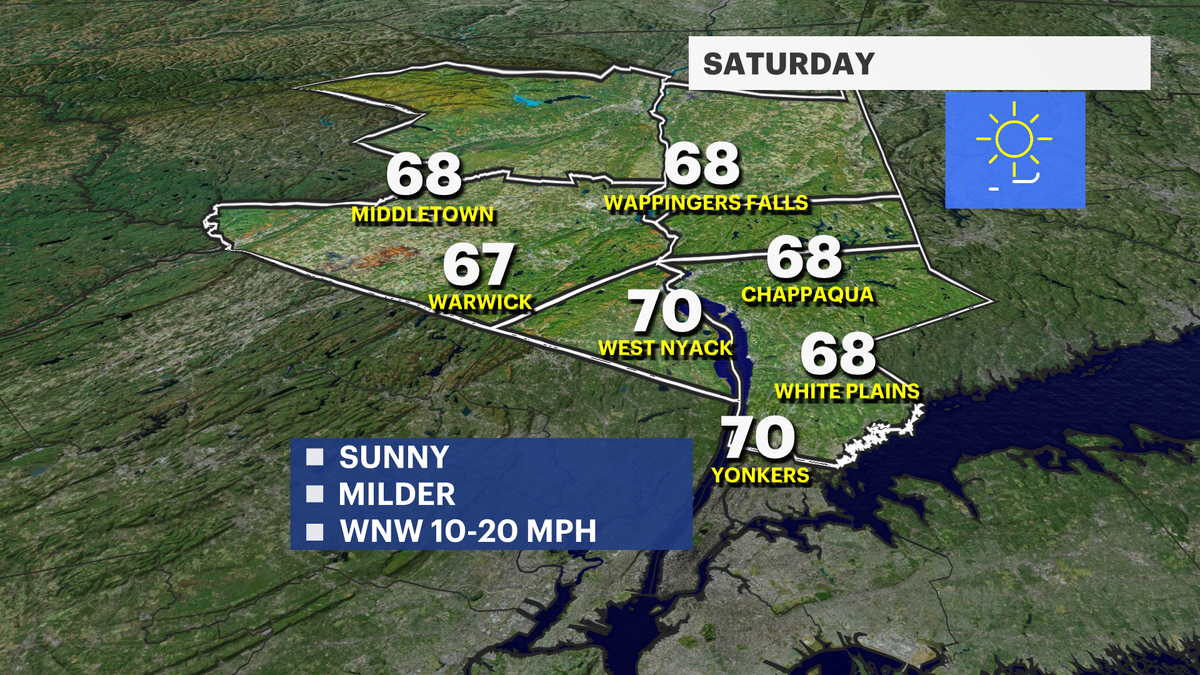SATURDAY: Mostly sunny and chilly to start. Frost possible to the north and west. Less breezy andvery nice in the afternoon. Lows in the 50s. Highs in the upper-60s.