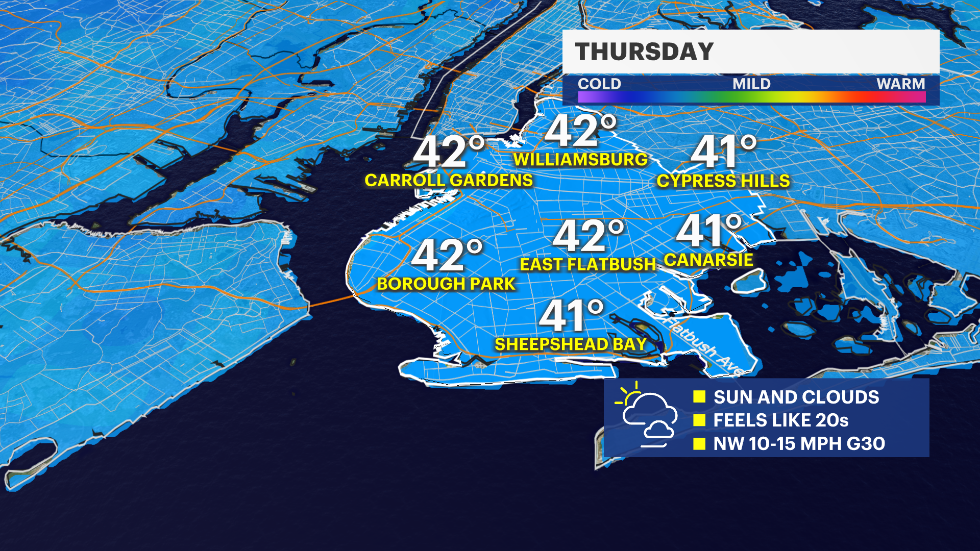 THURSDAY: Highs in the high 30s, lows in the low 20s. The wind will make it feel bitter. Sun and clouds with a stray flurry possible.