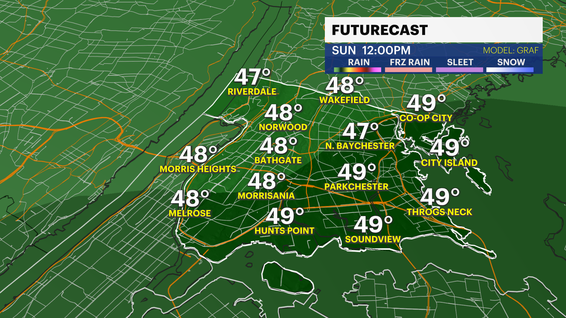 Rain moves in Sunday afternoon with breezy conditions and temperatures in the 40s and 50s. Expect slower travel and reduced visibility for part of the day.