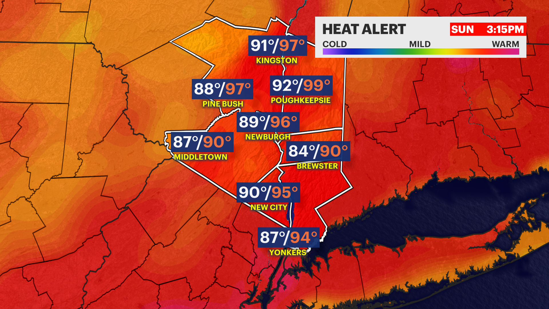SUNDAY: HEAT ALERT Sun and Clouds. A spotty afternoon shower or storm is possible, but dry for most. Highs near 92. Feels Like up to 100 degrees.