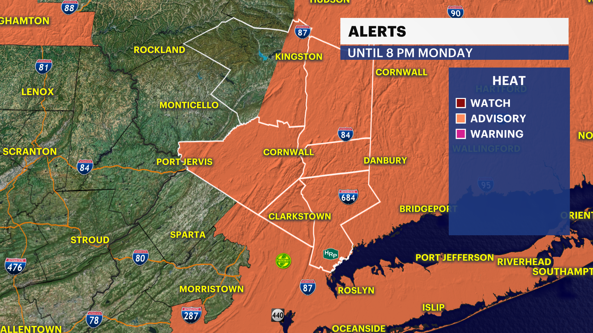 MONDAY: HEAT ALERT. More sunshine with just a stray pm storm. Highs in the low 90s. Heat Index near 100F.
