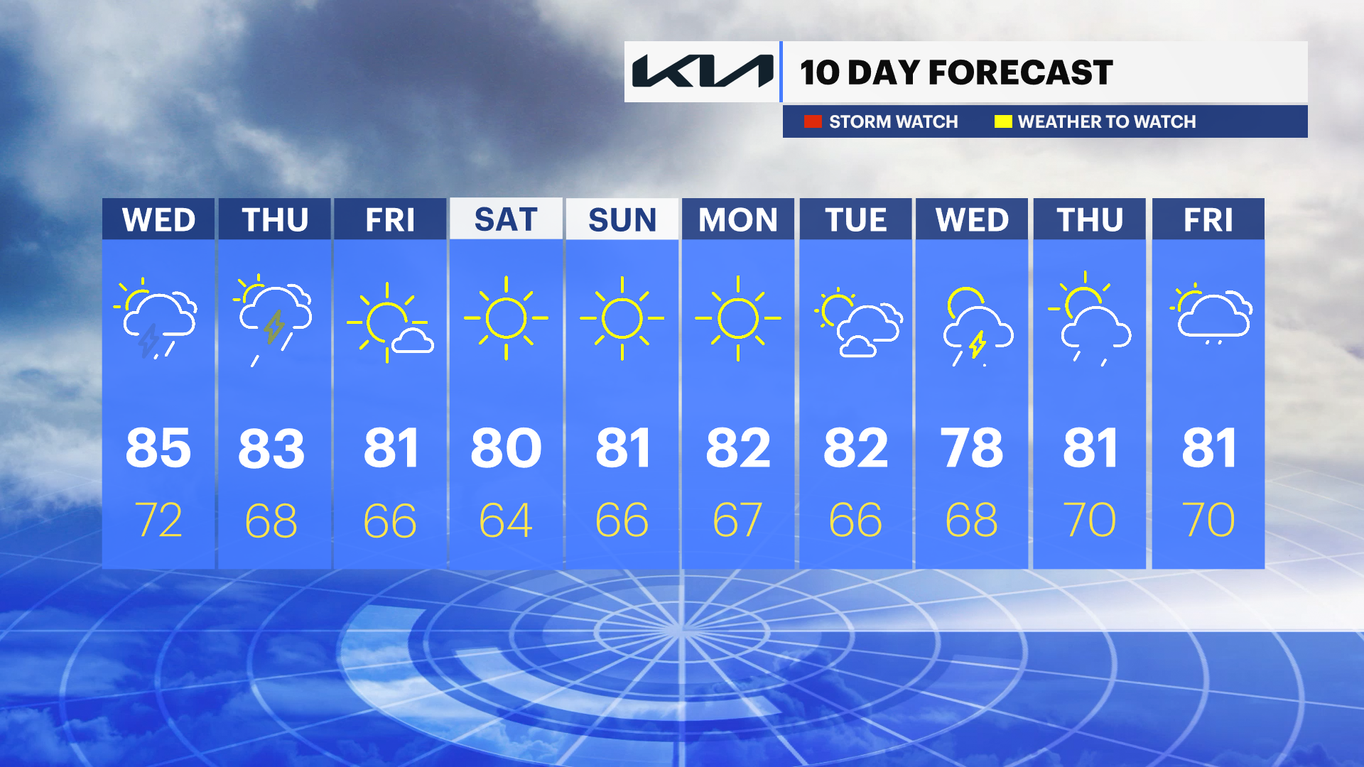 THURSDAY: Chance for a shower or storm, mainly in the morning then partly sunny. Highs near 82. Lows near 65.