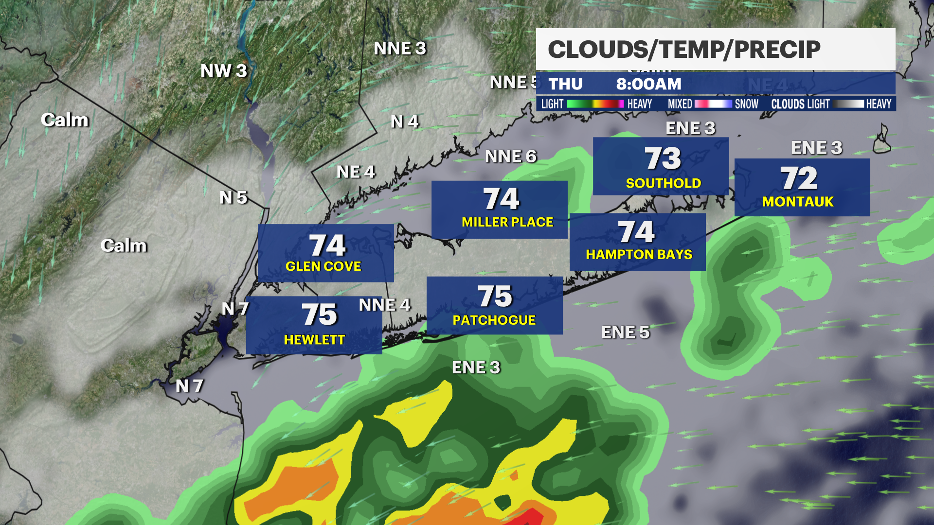 WEDNESDAY NIGHT: Chance for a few showers and storms with lows near 72. Southeast wind 5 to 10 mph.