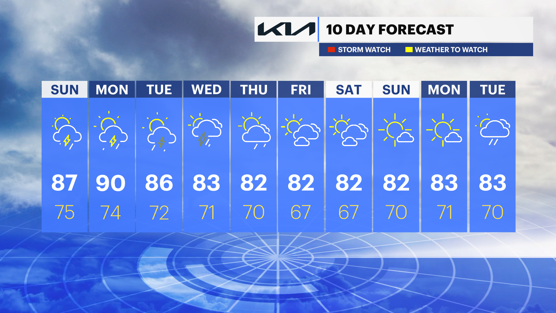 WEDNESDAY: Mainly cloudy with a few storms expected. Not as hot,