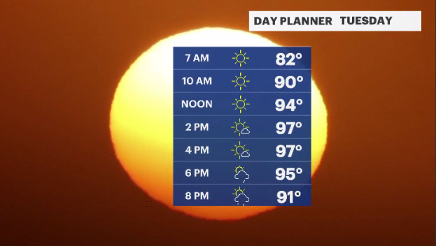 TUESDAY: Dangerously warm temperatures. Daytime highs expected to be around 97 degrees. Humidity may make it feel hotter. Possibility of some thunderstorms. Overnight lows in the upper-70s.