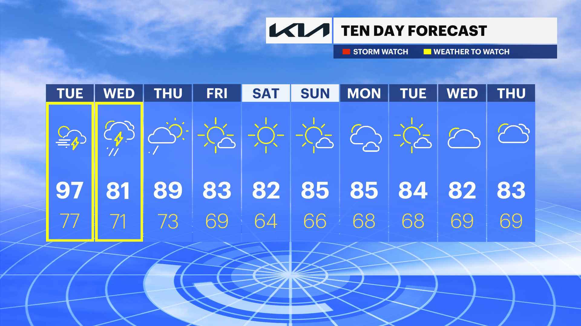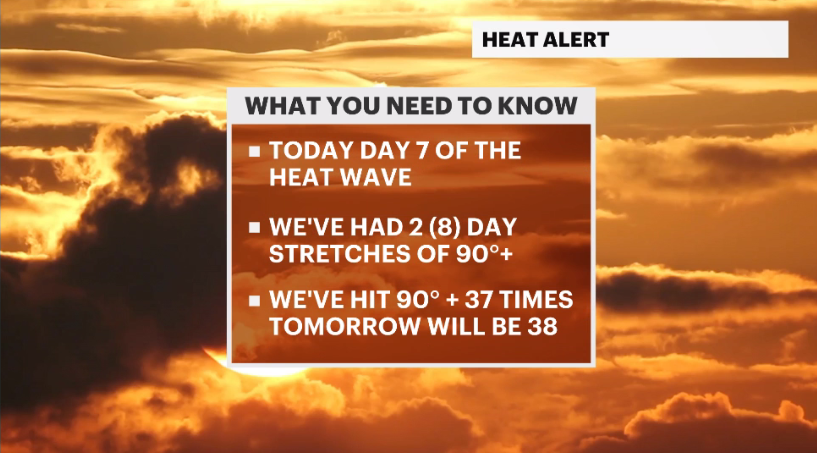 WEDNESDAY: Heat expected to break, with daytime highs in the low-80s. Possibility of thunderstorms. Overnight lows around 71.