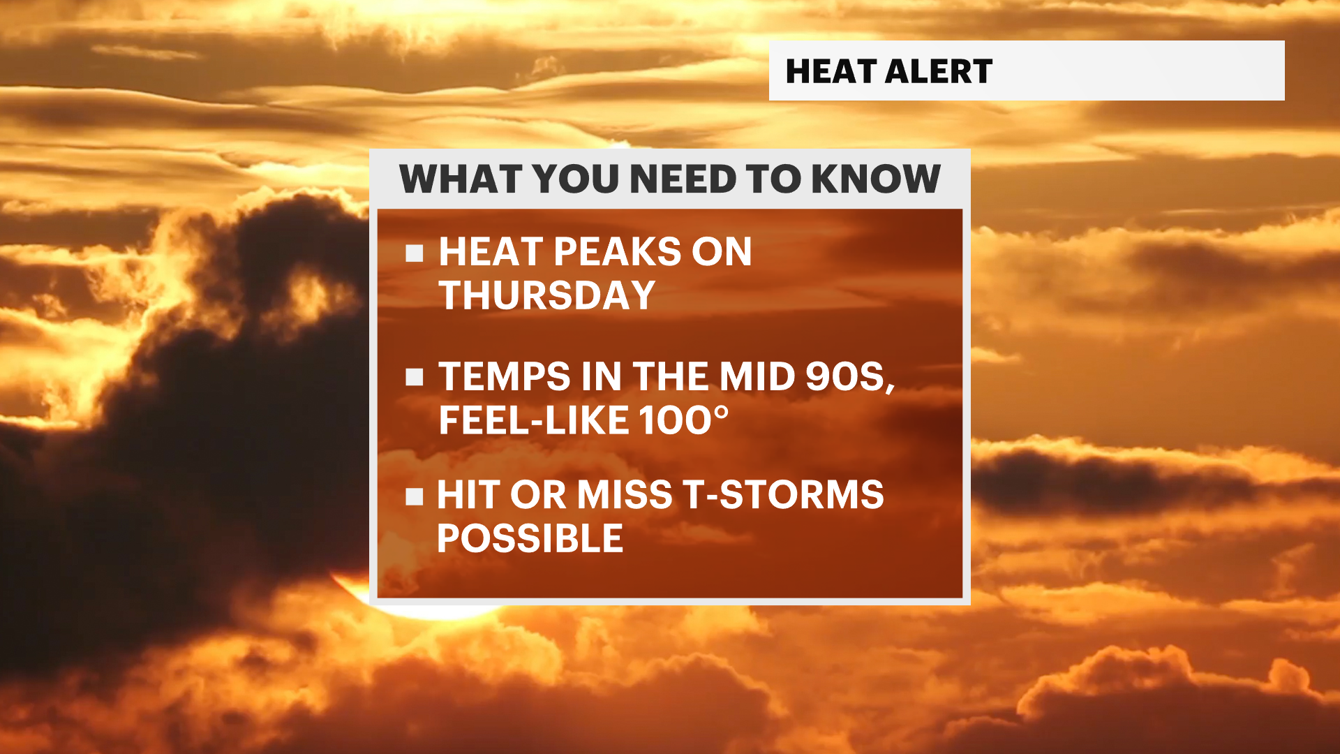 NEXT: Becoming muggy tonight into Thursday. Dangerously hot and humid conditions return on Thursday with pop-up storms possible.