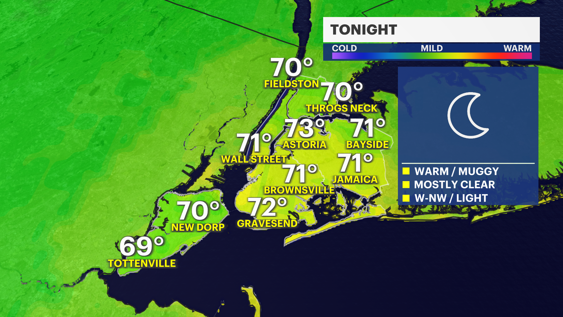 Overnight: Mostly clear sky and warm. Lows near 72.