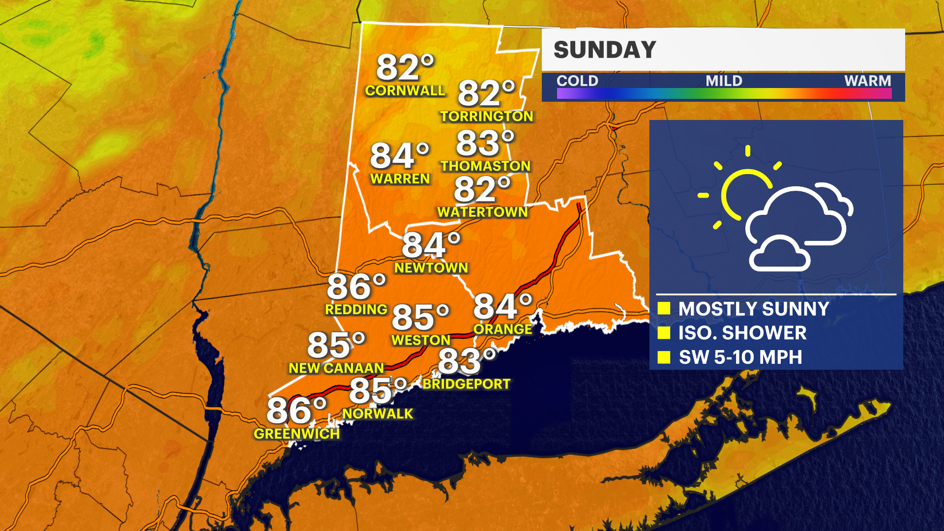 SUNDAY: Mostly sunny skies. High 83F. Winds SW at 10 to 20