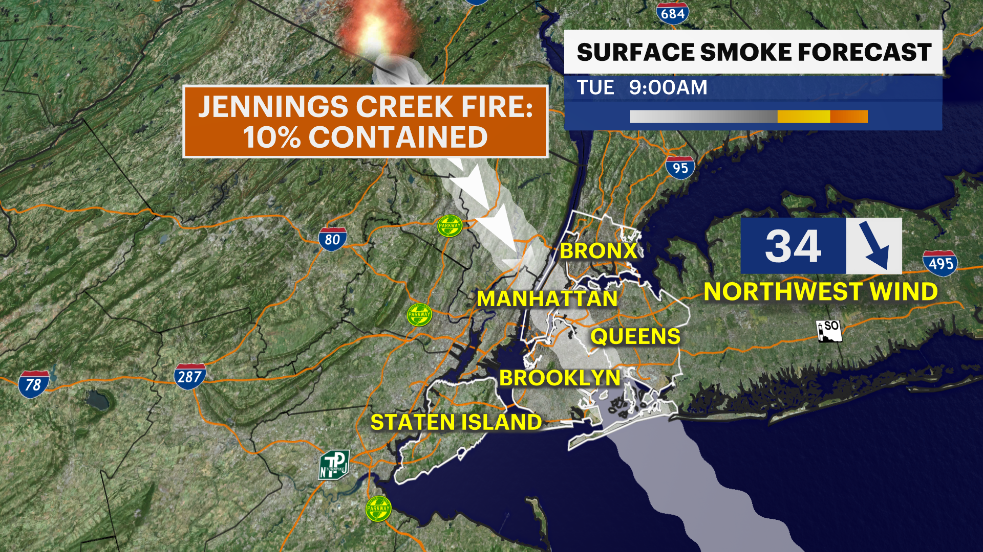 This will continue to keep the risk of brush fires and explosive fire growth high. Even with the sun down at night, the other three ingredients are still in place overnight Monday night and parts of Tuesday night. Even if there are no major new fires inside New York City, there is one major wildfire about 30 miles northwest of the city that will bring the wildfire smoke and dangerous air quality for Tuesday morning's commute.