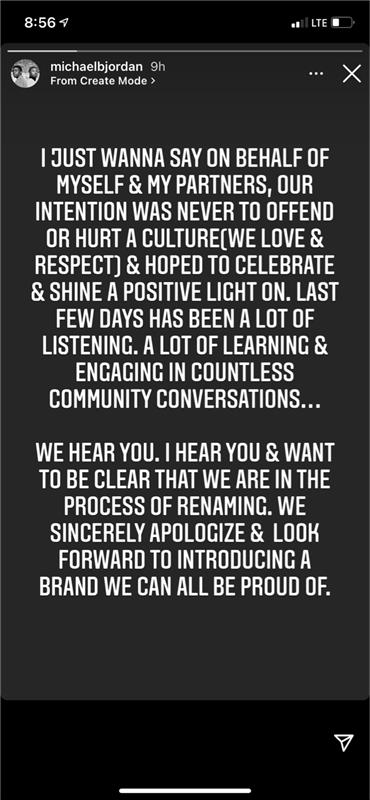 Jordan issued an apology on his official Instagram page saying, "I just wanna say on behalf of myself and my partners, our intention was never to offend or hurt a culture we love and respect and hoped to celebrate and shine a positive light on. Last few days has been a lot of listening. A lot of learning and engaging in countless community conversations... We hear you. I hear you and want to be clear that we are in the process of renaming. We sincerely apologize and look forward to introducing a brand we can all be proud of."