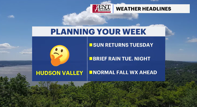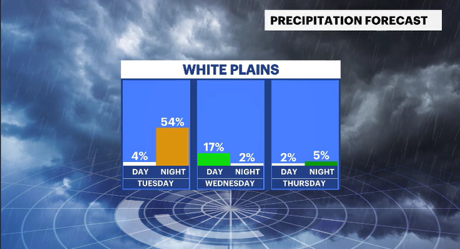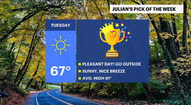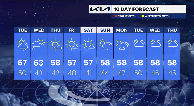 TUESDAY: PICK OF THE WEEK – Sunny, very pleasant, and less breezy. Clouds will increase in the evening with late rain showers expected at night. Highs in the mid-60s. Lows in the low 50s.