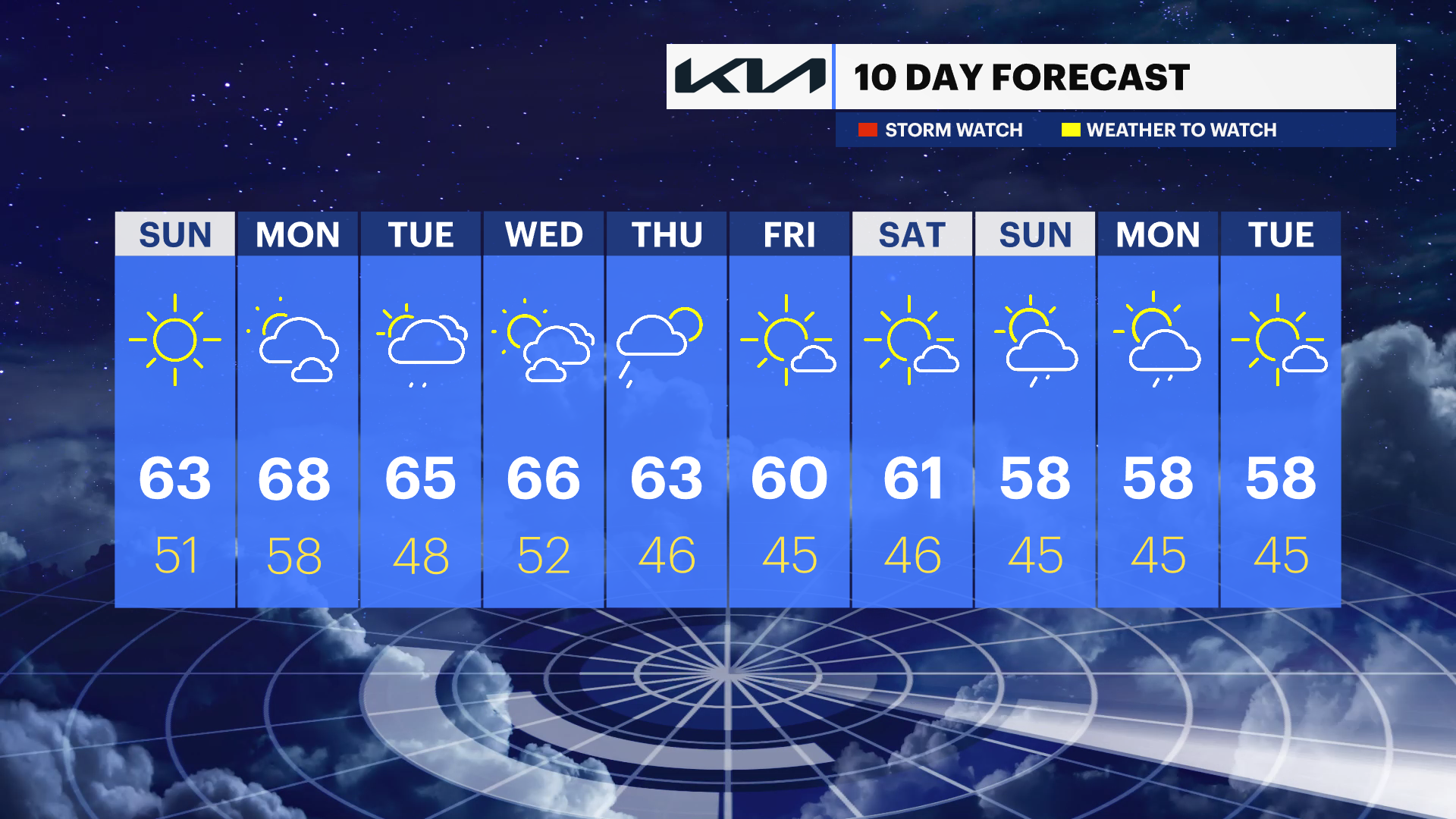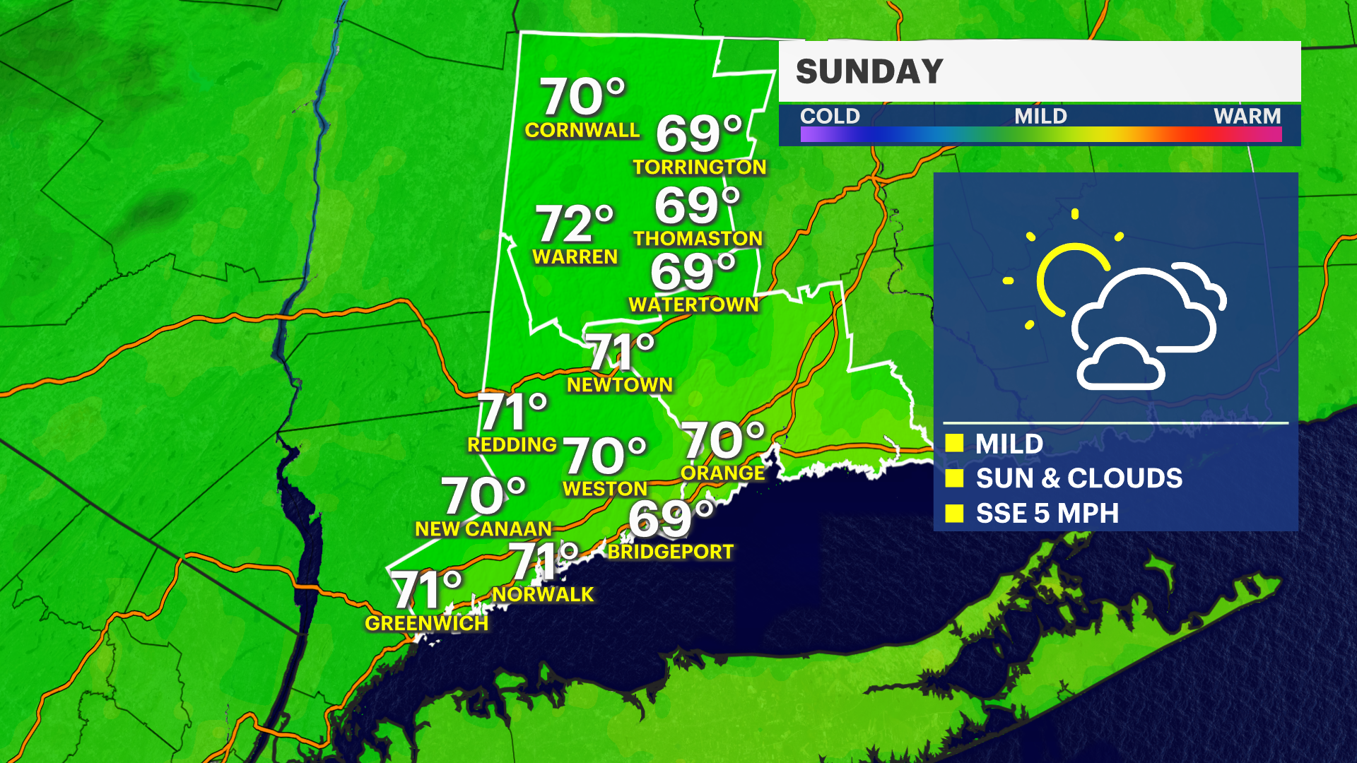 SUNDAY: Clouds build and wind increases. Late pm rain. Highs in the upper 60s low 70s. Lows in the middle 50s.
