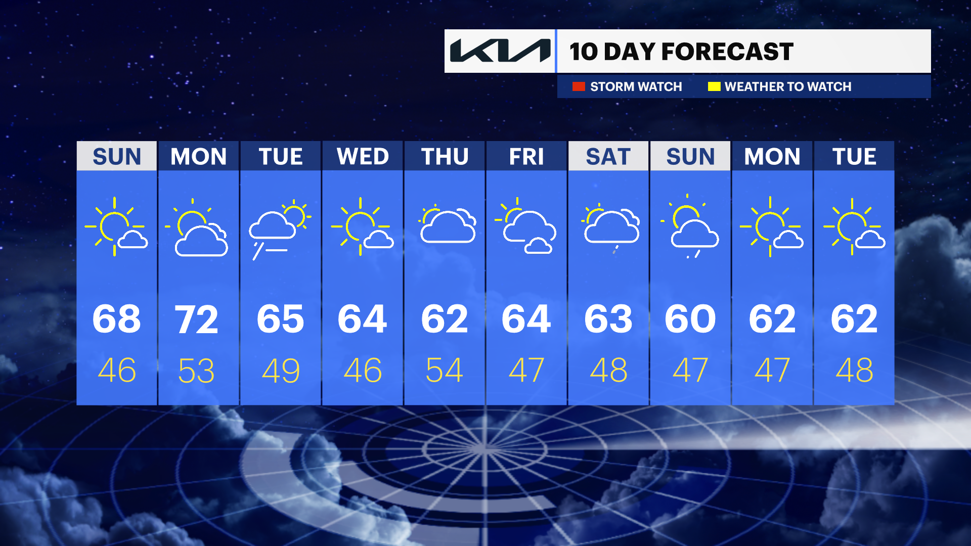 SUNDAY: Clouds build and wind increases. Late pm rain. Highs in the 70s. Lows in the middle 50s.