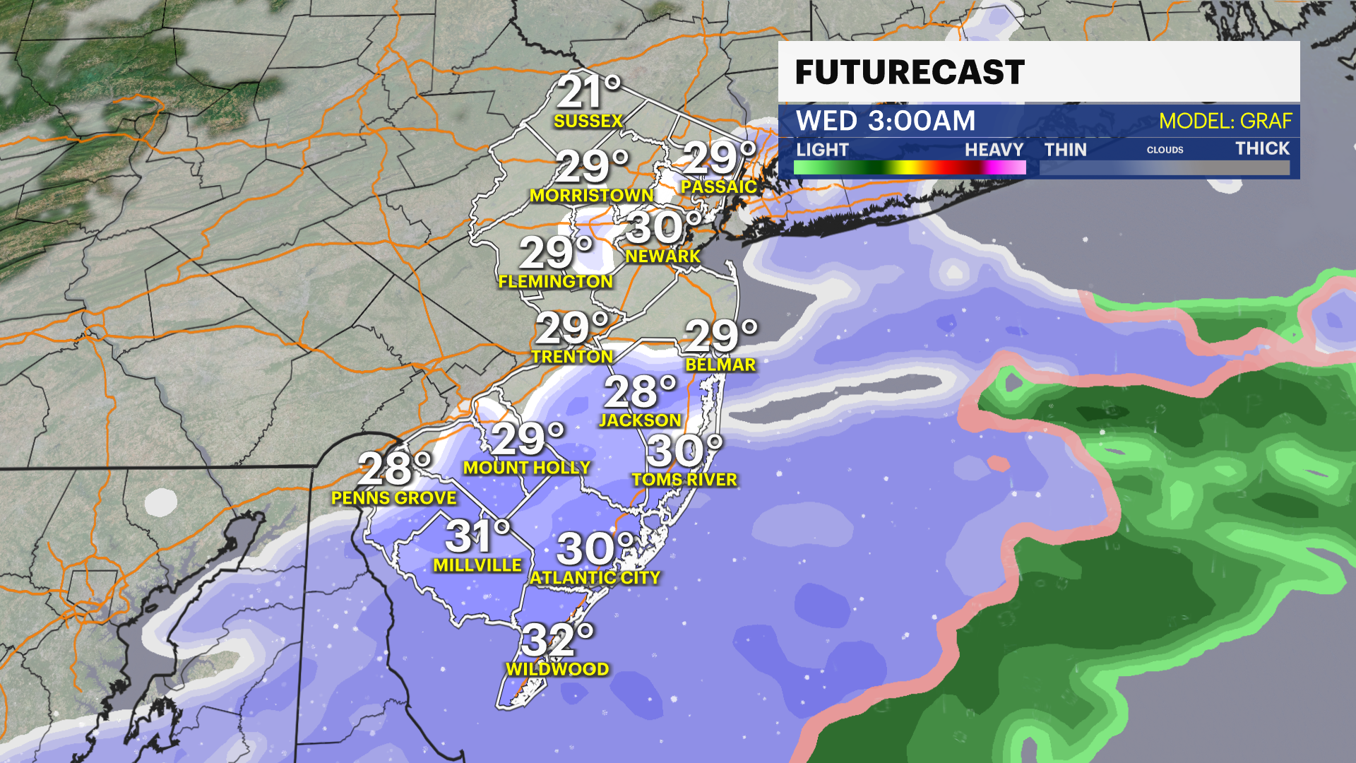 A coastal storm will slide by just offshore today. Most of the snow stays out to sea, but the storm will still crank up the winds across New Jersey, with northerly gusts around 25 to 30 miles per hour. Clouds will be tough to shake this afternoon, and while most areas stay dry, we can’t rule out a stray flurry, especially to the south and east.