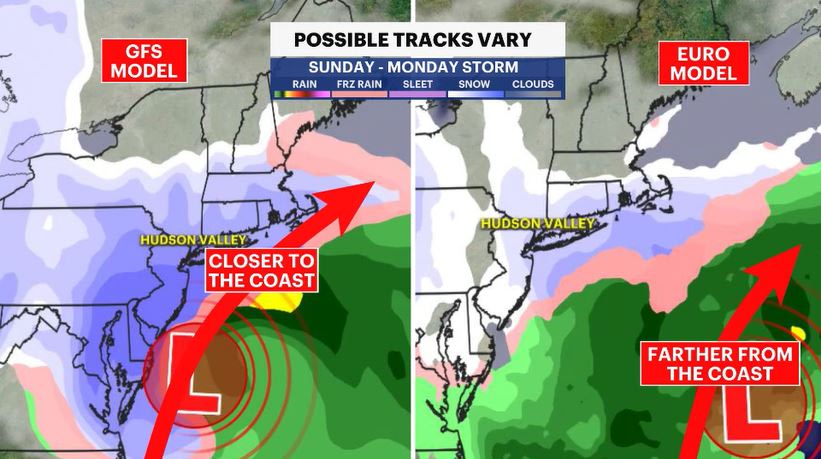 While Saturday looks like the clear winner with dry, seasonable weather and a mix of sun and clouds, things get tricky again heading into Sunday and Monday. The News 12 Storm Watch Team is currently watching a third system with plenty of "if’s" regarding its track as of Thursday evening. The American (GFS) model suggests the storm will hug the coast, potentially bringing several inches of snow and gusty winds. The European model pulls the system further out to sea, which would leave the Hudson Valley with nothing more than a few flurries and a breeze. The News 12 Storm Watch Team will be keeping a close eye on these models as they sync up, so stay tuned.