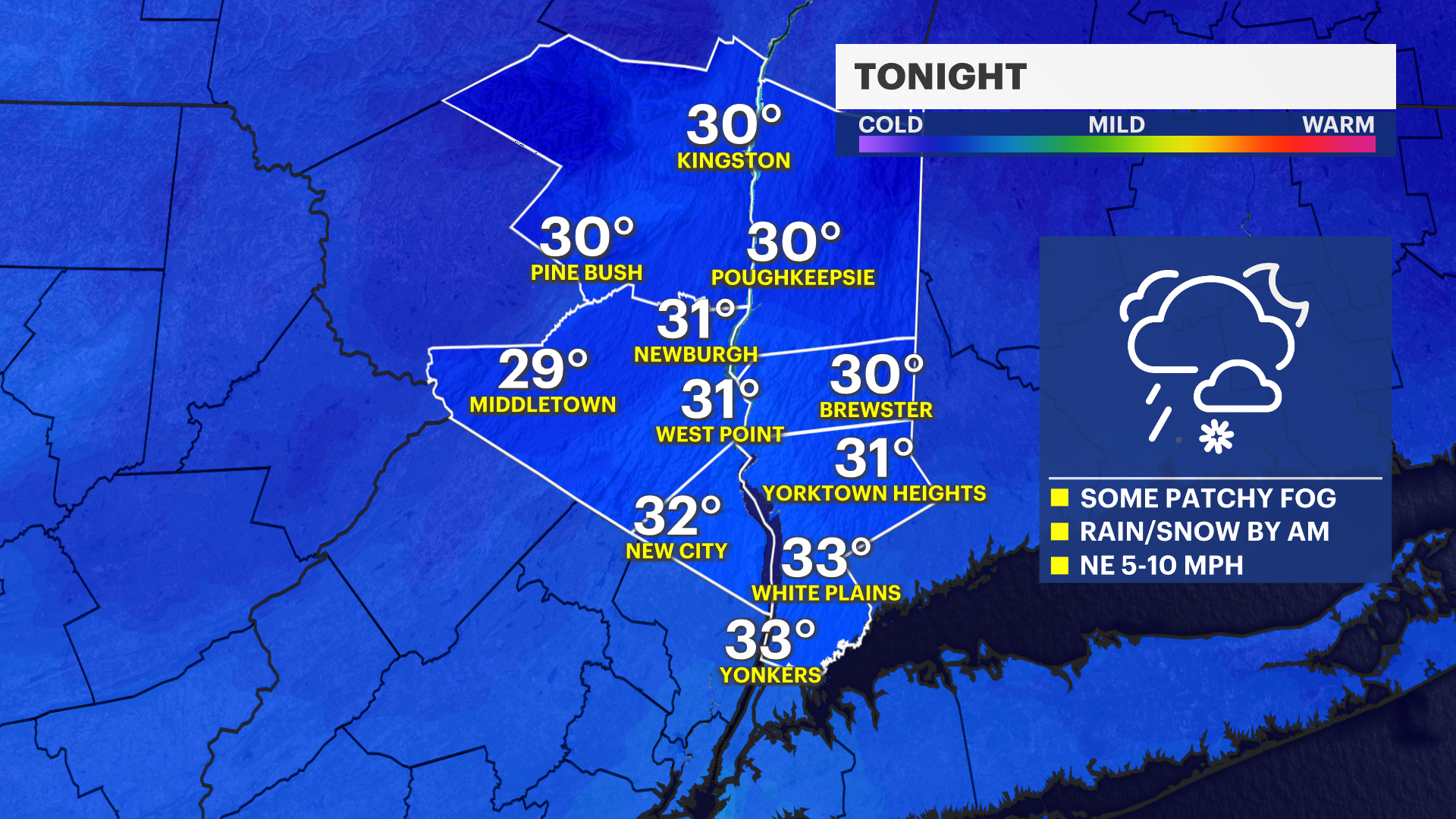 OVERNIGHT: Cloudy skies bring rain and snow showers by Friday morning daybreak. Lows in the upper 20s to mid-30s.