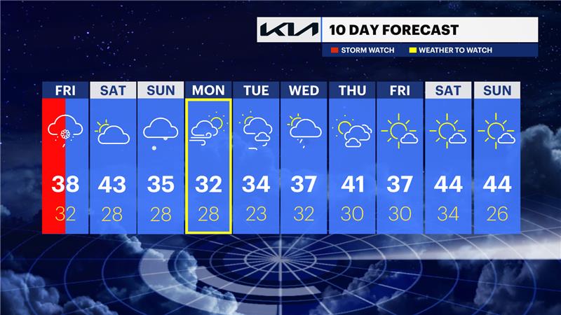FRIDAY: STORM WATCH (AM) - Morning rain and snow showers to scattered rain showers later in the day. Highs in the upper 30s. Lows in the low 30s.