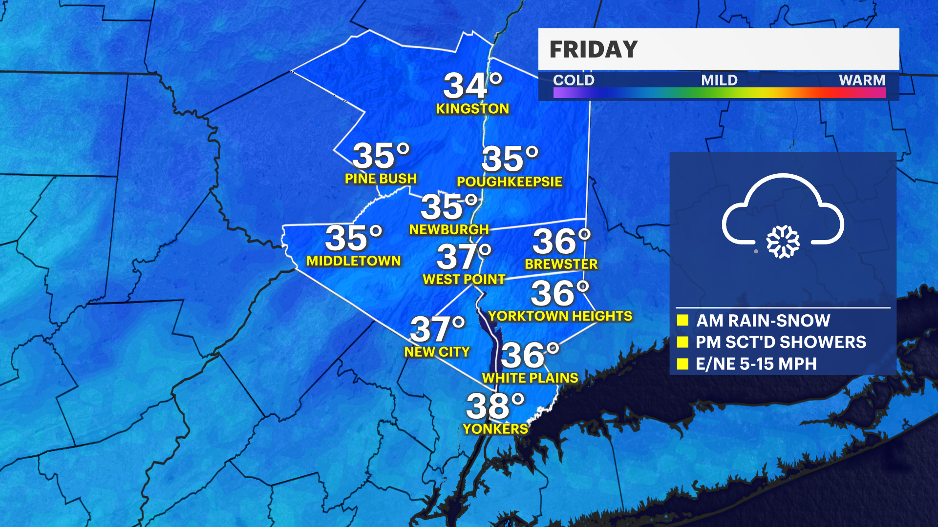 The next system moves in overnight, and with temperatures hovering in the low to mid-30s, things could get slick and icy just in time for the Friday morning commute, so you’ll definitely want to give yourself some extra travel time. The Hudson Valley will see a slight warm-up into the upper 30s by Friday afternoon, which should transition that wintry mix into on-and-off rain showers for the rest of the day.