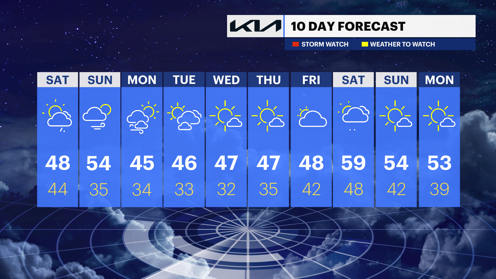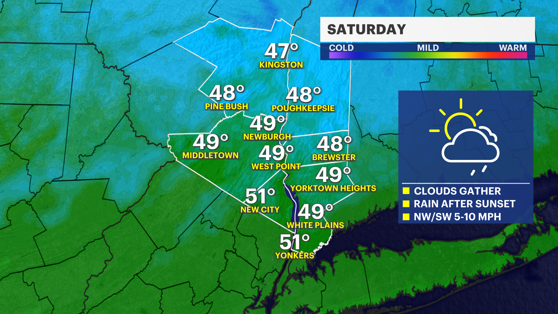 SATURDAY: Mostly sunny to mostly cloudy with rain moving in after sunset. Highs: upper 40s. Lows: mid-40s.