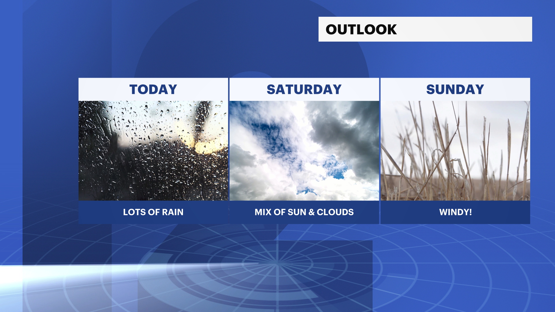 • Sunny breaks are possible Saturday morning before skies quickly turn mostly cloudy, with rain moving in after 4–5 p.m. Showers will come in batches through Saturday evening and overnight, bringing around 0.5 inch of total rainfall.