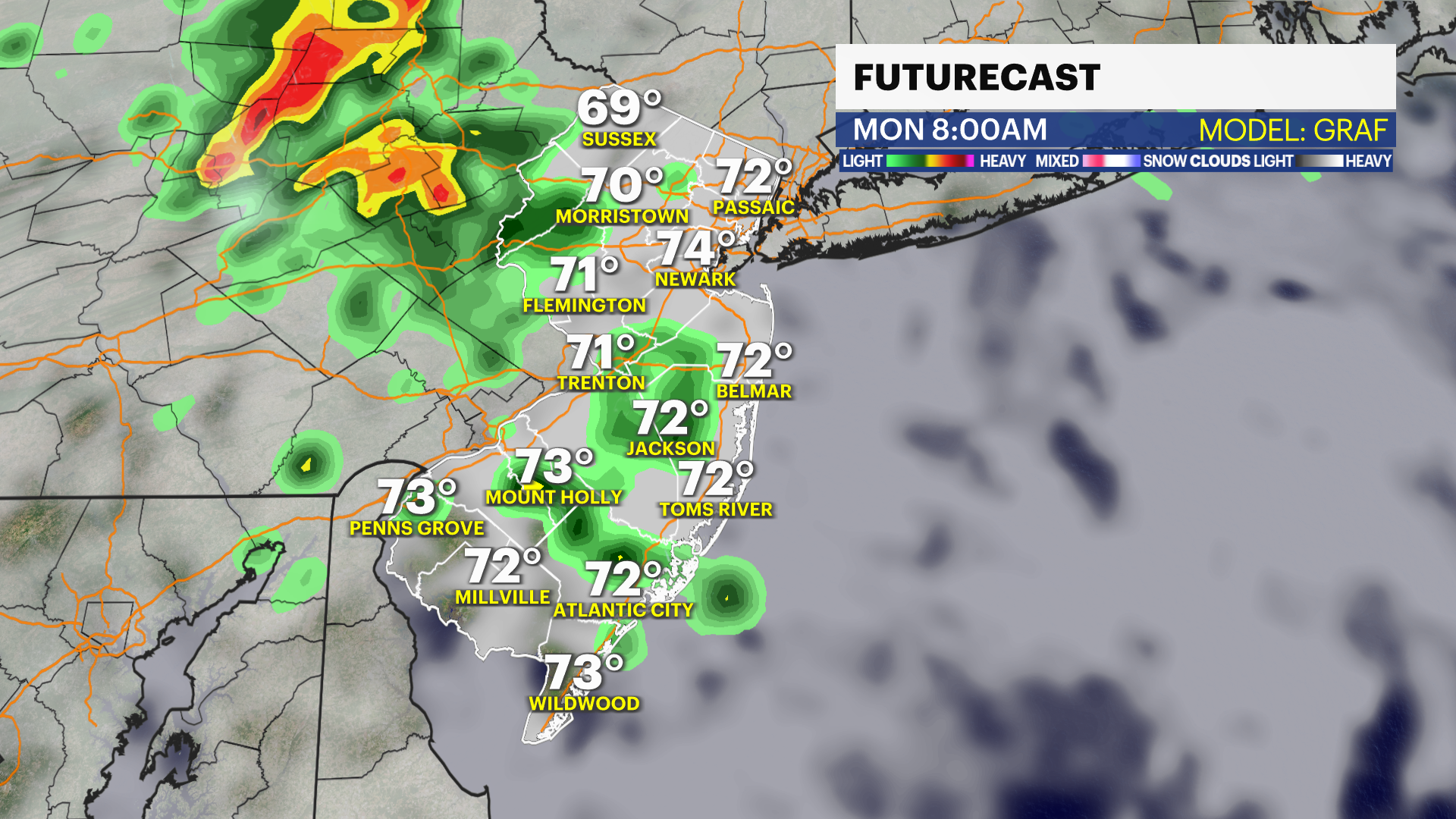 MONDAY: A steady rain early. Showers with perhaps a rumble of thunder developing in the afternoon. High 79. Winds SE at 5 to 10 mph. Chance of rain 70%.