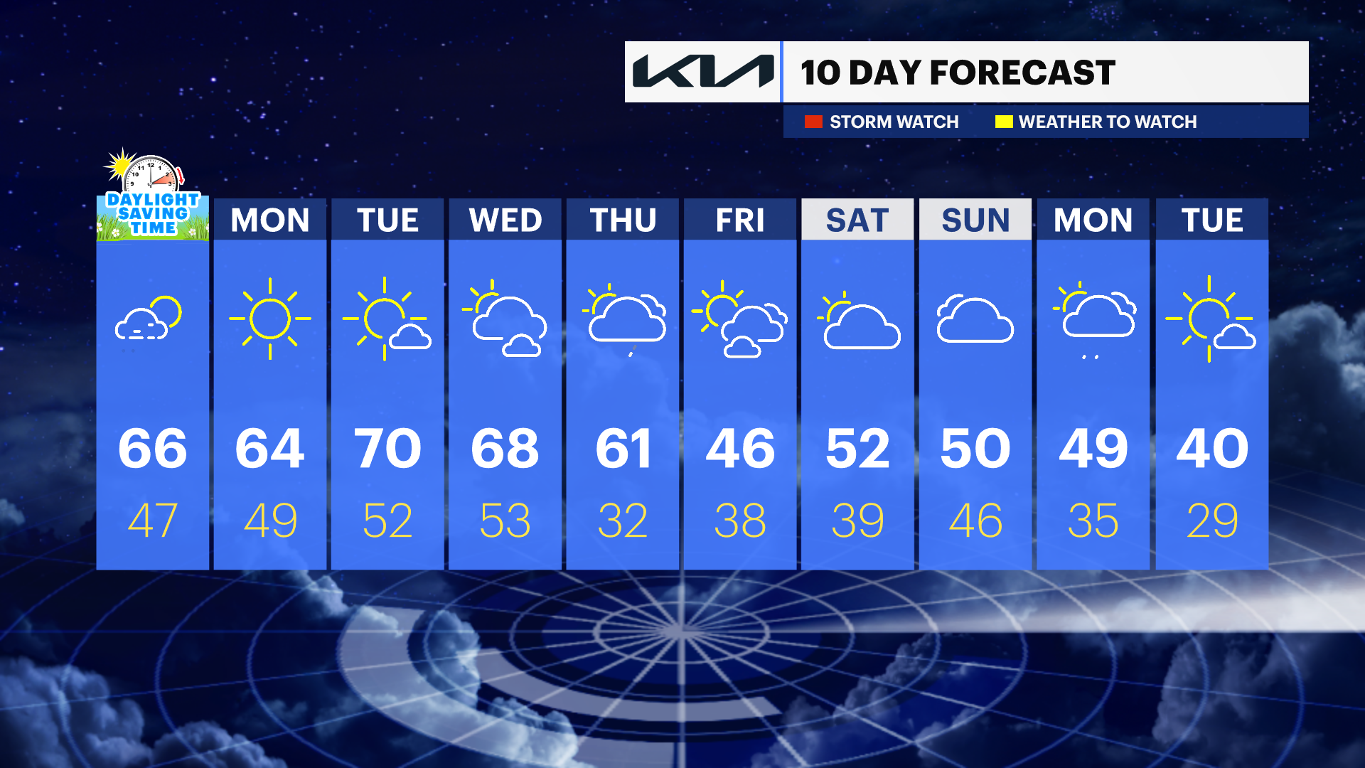 Monday is spectacular. Shallow fog persists for areas near the water, but otherwise it is sunny and mild with afternoon temperatures in the upper 50s or low 60s. A few spots will reach the mid 60s.