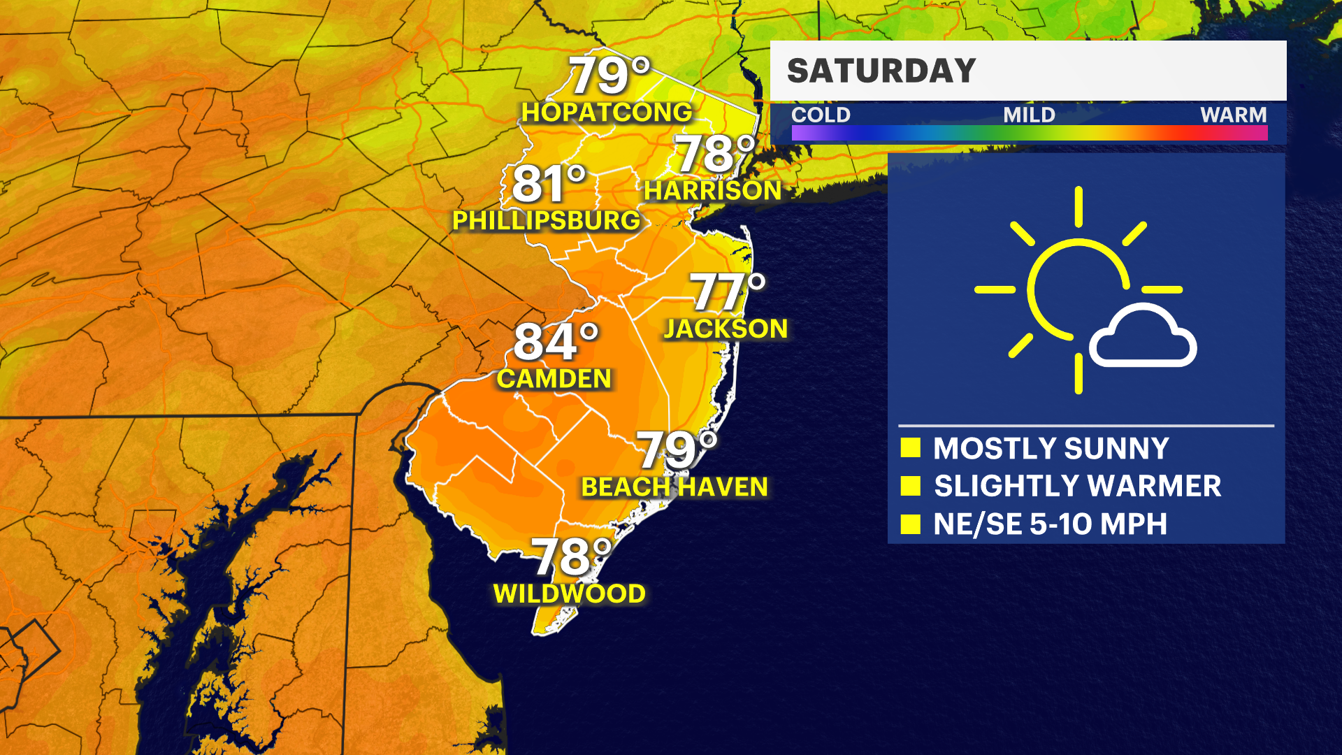 SATURDAY: Summer temperatures return, with daytime highs in the upper-70s and low-80s. Plenty of sunshine. Overnight lows around 50.