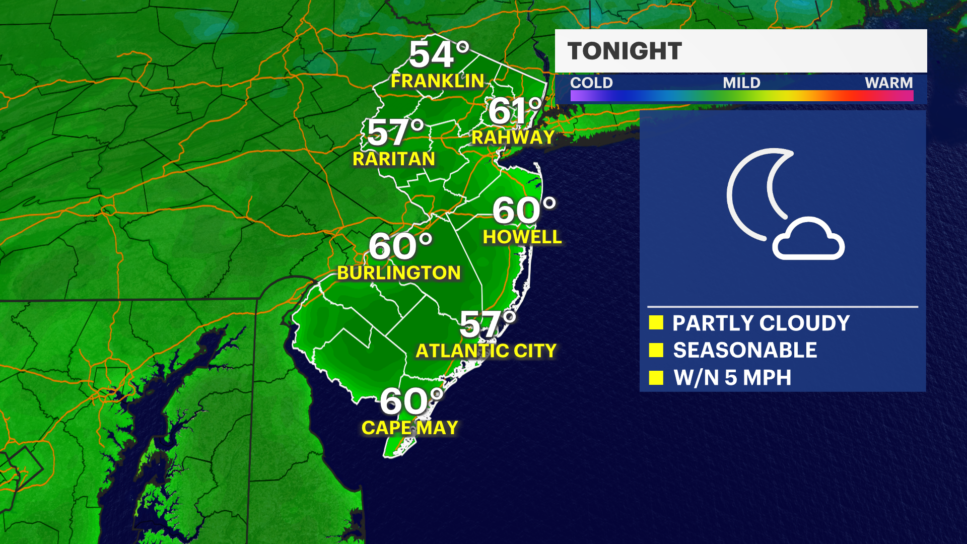 OVERNIGHT: Temperatures drop to the low-40s under mainly clear skies with a light breeze.