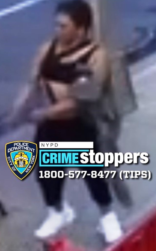 The suspect seen in the video is described as approximately 35 years old with a dark complexion, around 5 feet 5 inches tall, weighing 180 pounds and with short black hair. She was last seen wearing a black tank top, black pants, white sneakers and carrying a gray coat.
