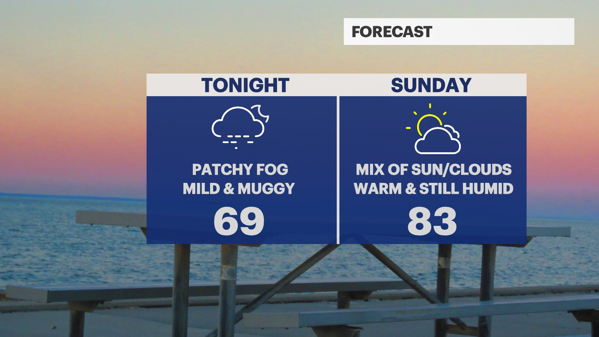 sunny and humid with highs near 82. East winds 5-10 mph.