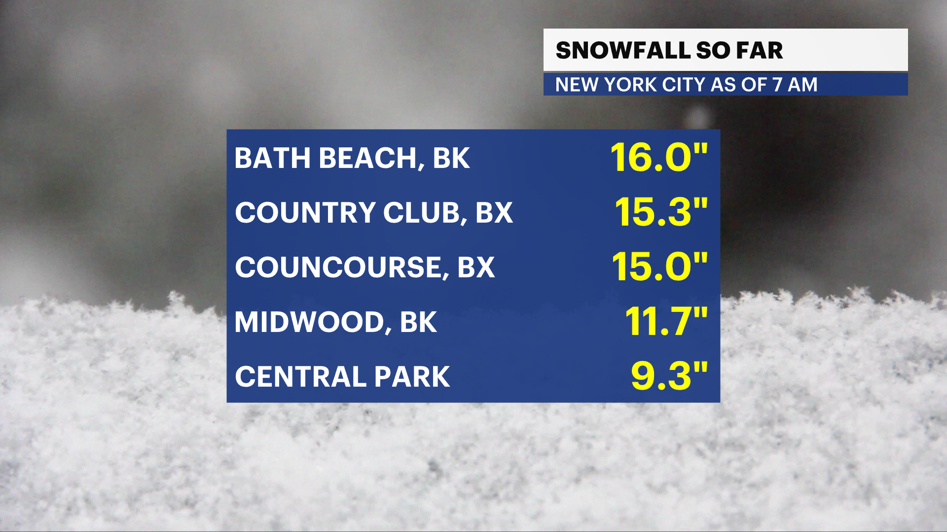 We've already accumulated 7-12" of snowfall across the city with an additional 5-10" of snowfall expected through this afternoon. Don't be surprised of a brief flash of lightning and roar of thunder in any heavy snow banding in the coming hours. We've already had radar indicated lightning within this snowstorm at Central Park. A major winter storm has moved into New York City and will continue to pummel the borough through the morning. Snow has quickly accumulated and and travel conditions have become dangerous. A Heavy snow and very low visibility are happening now, making travel dangerous or even impossible overnight. Snow could fall at rates of 1 to 3 inches per hour at times. By the time the storm winds down Monday afternoon, most of New York City could see around 15 to inches of snow, with isolated higher amounts possible.