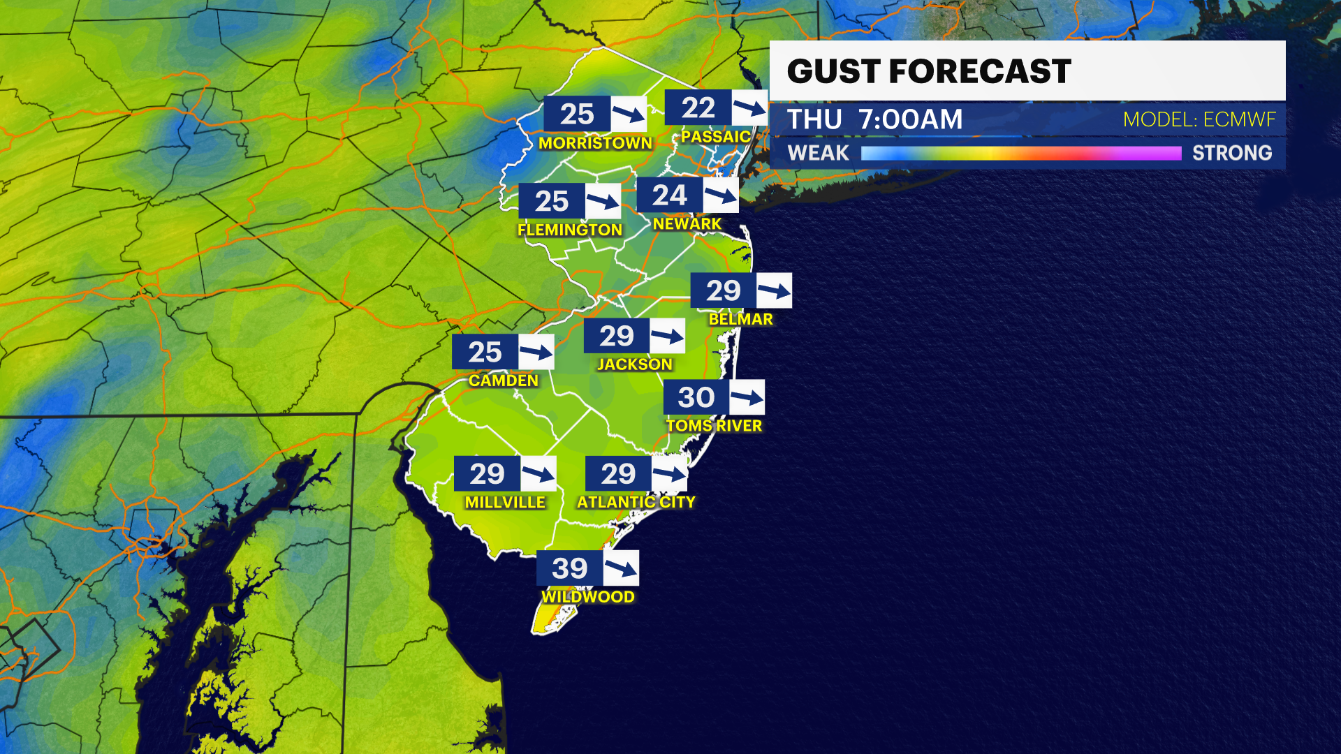 Windy weather arrives after the light dusting, where most accumulations stay north and west. Gusts on Thursday midday will be up to 30 mph at times, driving cold air into New Jersey. It will remain dry through Thursday evening.