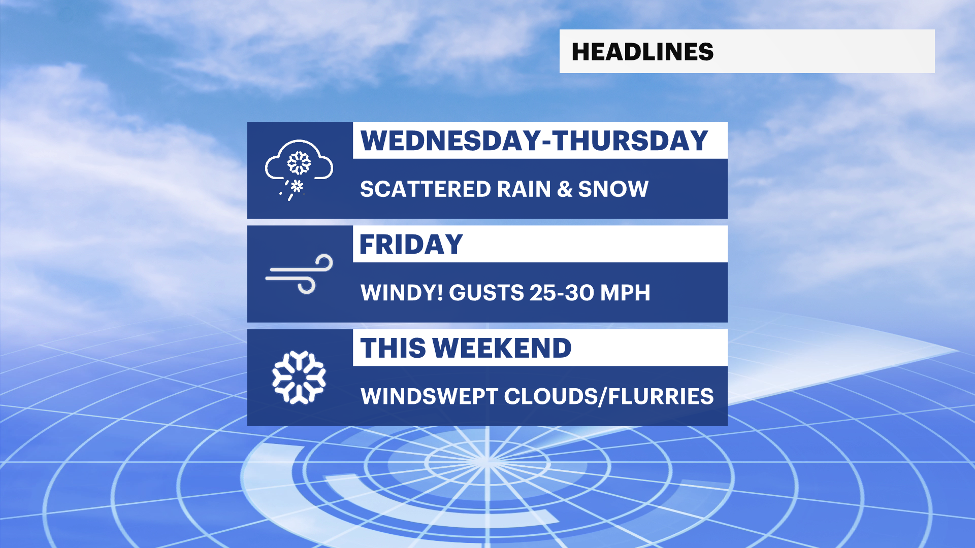 The weekend looks cold but decent with sun and windswept clouds capable of producing flurries or brief passing squalls.
